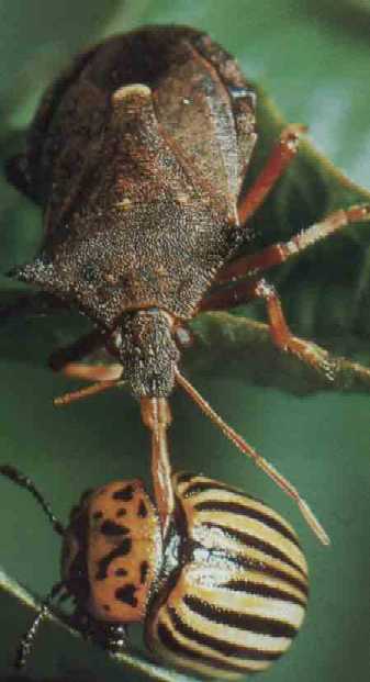 Raubwanzen können ziemlich groß werden bis zu 18 mm. Sie fühlen sich sogar stark genug den Kartoffelkäfer anzugreifen. (siehe Bild). Die Beute wird mit den Vorderbeinen gefangen und mit einem Giftstachel gelähmt und anschließend ausgesaugt. Eine andere Wanzenart ist die Blumenwanze die auch nur bis 5 mm groß wird. Ihr Jagdgebiet sind meist Obstbäume wo Blattläuse, Blattsauger und Spinnmilben zu finden sind. Sie sind schon im zeitigem Frühjahr aktiv. Die Larven der Blumenwanze haben immer Hunger und sie können bis zu 600 Spinnmilben oder200 Blattläuse verspeisen. Die ausgewachsenen Tiere schaffen nur bis zu 100 Spinnmilben am Tag. Manchmal findet man die Blumenwanze auch in Weidenkätzchen.